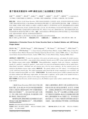 %u57fa%u91d1%u9879%u76ee%uff1a%u56fd%u5bb6%u81ea%u7136%u79d1%u5b66%u57fa%u91d1%u9879%u76ee%u8d44%u52a9%uff08%uff18%uff12%uff10%uff16%uff11%uff14%uff10%uff11%uff17%uff16%uff09%u4f5c%u8005%u7b80%u4ecb%uff1a%u5f20%u654f%uff0c%u5973%uff0c%u535a%u58eb%u7814%u7a76%u751f%uff0c%u526f%u6559%u6388 %u7814%u7a76%u65b9%u5411%uff1a%u4e2d%u836f%u5236%u5242%u5de5%u827a%u7814%u7a76 %ue012 %u901a%u8baf%u4f5c%u8005%uff1a%u9b4f%u8212%u7545%uff0c%u7537%uff0c%u7855%u58eb%uff0c%u6559%u6388 %u7814%u7a76%u65b9%u5411%uff1a%u4e2d%u836f%u5236%u5242%u5de5%u827a%u7814%u7a76 %uff34%uff45%uff4c%uff1a%uff08%uff10%uff19%uff13%uff11%uff09%uff15%uff11%uff16%uff12%uff18%uff18%uff17%u57fa%u4e8e%u57fa%u51c6%u5173%u8054%u5ea6%u548c %uff21%uff28%uff30%ue011%u71b5%u6743%u6cd5%u7684%u4e8c%u4ed9%u6c64%u9187%u63d0%u5de5%u827a%u7814%u7a76%u5f20%u654f%uff11%uff0c%uff12%uff0c%uff13%uff0c%uff14%uff0c%u9ec4%u96ea%u8273%uff11%uff0c%uff12%uff0c%uff13%uff0c%u66fe%u5e86%u7965%uff11%uff0c%uff12%uff0c%uff13%uff0c%u6b66%u6653%u7389%uff11%uff0c%uff12%uff0c%uff13%uff0c%u5218%u6653%u971e%uff11%uff0c%uff12%uff0c%uff13%uff0c%u51af%u6653%u8389%uff11%uff0c%uff12%uff0c%uff13%uff0c%u4ed8%u6587%u82ae%uff11%uff0c%uff12%uff0c%uff13%uff0c%u9b4f%u8212%u7545%uff11%uff0c%uff12%uff0c%uff13%ue012%uff08%uff11%uff0e%u7518%u8083%u4e2d%u533b%u836f%u5927%u5b66%uff0c%u5170%u5dde %uff17%uff13%uff10%uff10%uff10%uff10%uff1b%uff12%uff0e%u7518%u8083%u7701%u4e2d%u836f%u5236%u836f%u5de5%u827a%u5de5%u7a0b%u7814%u7a76%u4e2d%u5fc3%uff0c%u5170%u5dde %uff17%uff13%uff10%uff10%uff10%uff10%uff1b%uff13%uff0e%u9647%u836f%u4ea7%u4e1a%u521b%u65b0%u7814%u7a76%u9662%uff0c%u5170%u5dde %uff17%uff13%uff10%uff10%uff10%uff10%uff1b%uff14%uff0e%u7518%u8083%u533b%u5b66%u9662%uff0c%u7518%u8083 %u5e73%u51c9 %uff17%uff14%uff14%uff10%uff10%uff10%uff09%u6458%u8981%uff1a%u76ee%u7684 %u4e3a%u4fdd%u8bc1%u4e8c%u4ed9%u6c64%uff08%uff25%uff52%uff58%uff49%uff41%uff4e%uff24%uff45%uff43%uff4f%uff43%uff54%uff49%uff4f%uff4e%uff0c%uff25%uff38%uff24%uff09%u4f20%u7edf%u6c64%u5242%u548c%u9187%u63d0%u5de5%u827a%u7684%u8d28%u91cf%u4e00%u81f4%u6027%uff0c%u91c7%u7528%u57fa%u51c6%u5173%u8054%u5ea6%u548c%u5c42%u6b21%u5206%u6790%u6cd5%uff08%uff21%uff28%uff30%uff09%ue011%u71b5%u6743%u6cd5%u786e%u5b9a%u6743%u91cd%u7cfb%u6570%uff0c%u4ee5 %uff22%uff4f%uff58%ue011%uff22%uff45%uff48%uff4e%uff4b%uff45%uff4e%u54cd%u5e94%u9762%u6cd5%u4f18%u9009 %uff25%uff38%uff24%u9187%u63d0%u5de5%u827a%uff0c%u4e3a%u73b0%u4ee3%u5236%u5242%u7814%u7a76%u5960%u5b9a%u57fa%u7840%u3002%u65b9%u6cd5 %u4ee5%u9ec4%u67cf%u78b1%u3001%u8292%u679c%u82f7%u3001%u963f%u9b4f%u9178%u3001%u5c0f%u6a97%u78b1%u3001%u4ed9%u8305%u82f7%u3001%u671d%u85ff%u5b9a %uff21%uff11%uff0c%u671d%u85ff%u5b9a %uff21%uff0c%u671d%u85ff%u5b9a %uff22%uff0c%u671d%u85ff%u5b9a %uff23%uff0c%u6deb%u7f8a%u85ff%u82f7%u542b%u91cf%u3001%u51fa%u818f%u7387%u3001%u6307%u7eb9%u56fe%u8c31%u76f8%u4f3c%u5ea6%u4f5c%u4e3a%u5173%u952e%u8d28%u91cf%u56e0%u7d20%uff0c%u4ee5%u4e59%u9187%u4f53%u79ef%u5206%u6570%u3001%u6599%u6db2%u6bd4%u3001%u63d0%u53d6%u65f6%u95f4%u4e3a%u5173%u952e%u5de5%u827a%u53c2%u6570%uff0c%u7ed3%u5408 %uff22%uff4f%uff58%ue011%uff22%uff45%uff48%uff4e%uff4b%uff45%uff4e%u54cd%u5e94%u9762%u6cd5%u5f97%u5230%u6700%u4f73%u63d0%u53d6%u5de5%u827a%u5e76%u9a8c%u8bc1%u3002%u7ed3%u679c %u786e%u5b9a%uff25%uff38%uff24%u9187%u63d0%u5de5%u827a%u7684%u6700%u4f73%u6761%u4ef6%u4e3a%u4e59%u9187%u4f53%u79ef%u5206%u6570 %uff17%uff15%uff05%uff0c%u6599%u6db2%u6bd4 %uff11%u2236%uff11%uff14%uff08%uff47%u2236%uff4d%uff2c%uff09%uff0c%u63d0%u53d6%u65f6%u95f4 %uff16%uff12%uff4d%uff49%uff4e%u3002%u9a8c%u8bc1%u5b9e%u9a8c%u7ed3%u679c%u8868%u660e%uff0c%u7efc%u5408%u8bc4%u5206%u5747%u503c %uff18%uff16%ue010%uff16%uff14%uff0c%u76f8%u5bf9%u6807%u51c6%u5dee%uff08%uff32%uff33%uff24%uff09%u4e3a %uff11%ue010%uff10%uff12%uff05%u3002%u7ed3%u8bba %u57fa%u51c6%u5173%u8054%u5ea6%u7ed3%u5408 %uff21%uff28%uff30%ue011%u71b5%u6743%u6cd5%u4f18%u5316 %uff25%uff38%uff24%u8fdb%u884c%u9187%u63d0%u5de5%u827a%uff0c%u6240%u62df%u5408%u7684%u6a21%u578b%u663e%u8457%uff0c%u4e0e%u57fa%u51c6%u6c64%u5242%u8d28%u91cf%u4e00%u81f4%u5ea6%u9ad8%uff0c%u4e3a%u540e%u671f%u5242%u578b%u66f4%u6539%u63d0%u4f9b%u53c2%u8003%u3002%u5173%u952e%u8bcd%uff1a%u4e8c%u4ed9%u6c64%uff1b%u9187%u63d0%u5de5%u827a%uff1b%uff22%uff4f%uff58%ue011%uff22%uff45%uff48%uff4e%uff4b%uff45%uff4e%u54cd%u5e94%u9762%u6cd5%uff1b%u57fa%u51c6%u5173%u8054%u5ea6%uff1b%u5c42%u6b21%u5206%u6790%u6cd5%ue011%u71b5%u6743%u6cd5%uff44%uff4f%uff49%uff1a%uff11%uff10%ue010%uff11%uff11%uff16%uff16%uff19%uff0f%uff43%uff50%uff4a%ue010%uff12%uff10%uff12%uff15%ue010%uff10%uff18%ue010%uff10%uff10%uff14 %u4e2d%u56fe%u5206%u7c7b%u53f7%uff1a%uff32%uff12%uff18%uff12 %u6587%u732e%u6807%u5fd7%u7801%uff1a%uff21 %u6587%u7ae0%u7f16%u53f7%uff1a%uff11%uff10%uff10%uff11%uff0d%uff12%uff14%uff19%uff14%uff08%uff12%uff10%uff12%uff15%uff09%uff10%uff18%uff0d%uff10%uff18%uff10%uff11%uff0d%uff10%uff18%uff2f%uff50%uff54%uff49%uff4d%uff49%uff5a%uff41%uff54%uff49%uff4f%uff4e%uff4f%uff46%uff25%uff58%uff54%uff52%uff41%uff43%uff54%uff49%uff4f%uff4e%uff30%uff52%uff4f%uff43%uff45%uff53%uff53%uff46%uff4f%uff52%uff25%uff52%uff58%uff49%uff41%uff4e%uff24%uff45%uff43%uff4f%uff43%uff54%uff49%uff4f%uff4e%uff22%uff41%uff53%uff45%uff44%uff4f%uff4e%uff33%uff54%uff41%uff4e%uff44%uff41%uff52%uff44%uff32%uff45%uff4c%uff41%uff54%uff49%uff4f%uff4e%uff41%uff4e%uff44%uff21%uff28%uff30%ue011%uff25%uff4e%uff54%uff52%uff4f%uff50%uff59%uff37%uff45%uff49%uff47%uff48%uff54%uff2d%uff45%uff54%uff48%uff4f%uff44%uff3a%uff28%uff21%uff2e%uff27%uff2d%uff49%uff4e%uff11%uff0c%uff12%uff0c%uff13%uff0c%uff14%uff0c%uff28%uff35%uff21%uff2e%uff27%uff38%uff55%uff45%uff59%uff41%uff4e%uff11%uff0c%uff12%uff0c%uff13%uff0c%uff3a%uff25%uff2e%uff27%uff31%uff49%uff4e%uff47%uff58%uff49%uff41%uff4e%uff47%uff11%uff0c%uff12%uff0c%uff13%uff0c%uff37%uff35%uff38%uff49%uff41%uff4f%uff59%uff55%uff11%uff0c%uff12%uff0c%uff13%uff0c%uff2c%uff29%uff35%uff38%uff49%uff41%uff4f%uff58%uff49%uff41%uff11%uff0c%uff12%uff0c%uff13%uff0c%uff26%uff25%uff2e%uff27%uff38%uff49%uff41%uff4f%uff4c%uff49%uff11%uff0c%uff12%uff