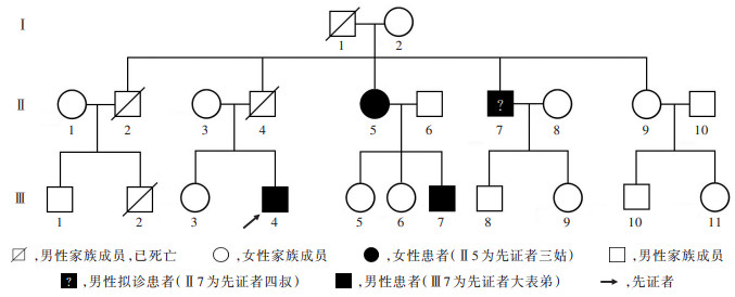 目的: 报道强直性肌营养不良一家系的临床表现、电生理学特点和基因检测结果,总结疾病的临床和遗传学特征。方法与结果: 先证者为男性,25岁,隐匿发病,临床表现为“斧状脸”的特殊面容和秃发,四肢无力、肌萎缩,伴多系统如内分泌系统和心脏损害;家族中三姑、四叔和大表弟有类似临床症状。基因检测,先证者及其三姑、大表弟DMPK基因CTG序列重复次数> 100次。针极肌电图检查,先证者及其三姑、大表弟均表现为肌强直电位和肌源性损害共存,先证者左侧腓总神经运动传导速度稍减慢且波幅降低、感觉神经传导速度减慢。先证者及其三姑、大表弟确诊为强直性肌营养不良1型,该家系明确为强直性肌营养不良家系。结论: 强直性肌营养不良是一组以肌无力、肌强直和肌萎缩为特点的累及多系统的常染色体显性遗传性疾病,临床表现复杂多样且较为罕见,应注意家族史、临床体征和电生理检测结果尤其是肌强直电位的识别,基因检测对疾病的诊断与鉴别诊断具有重要意义。